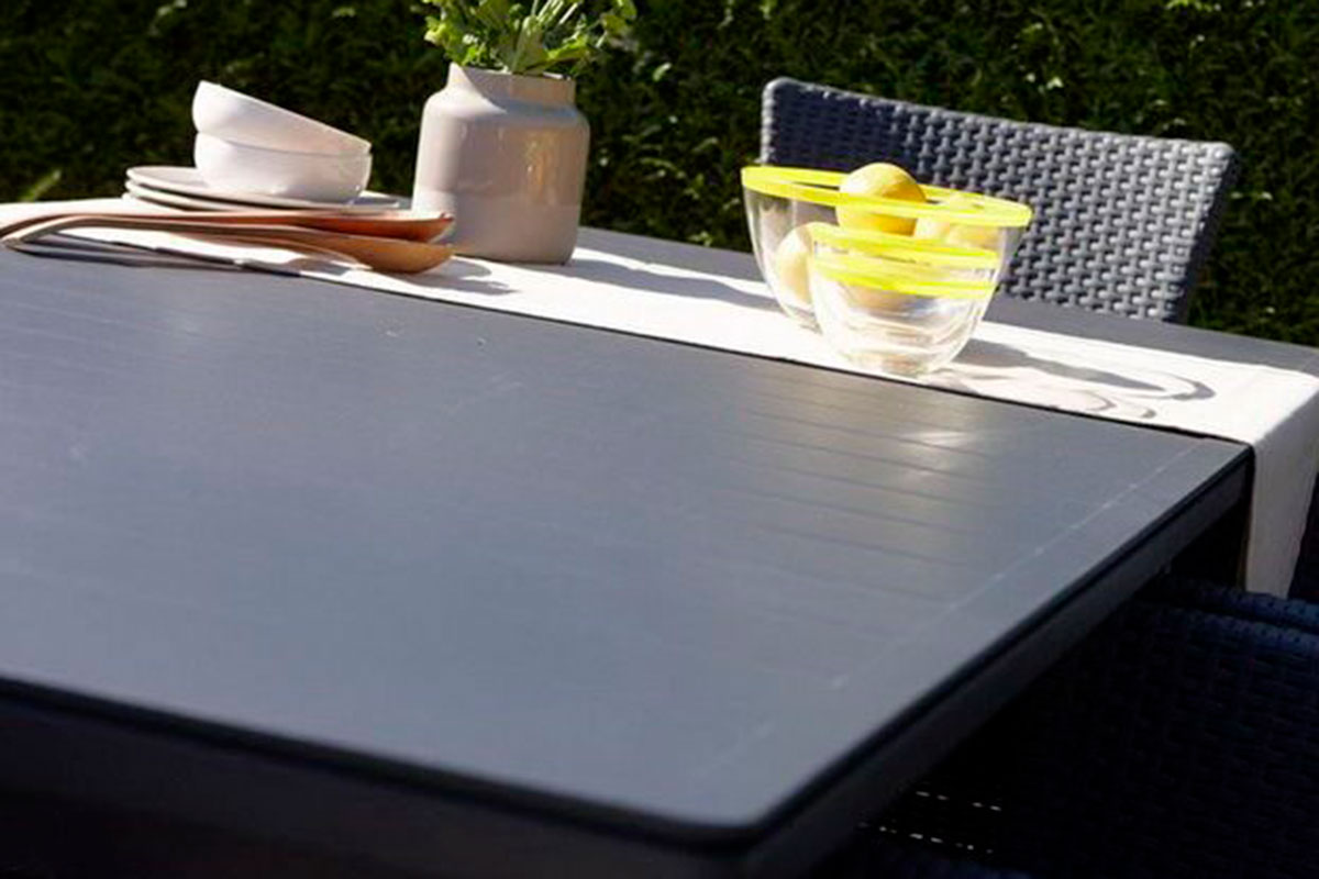 Удобный и прочный пластиковый стол Futura на 4-6 человек без стекла от компании KETER порадует любителей плетеной мебели своей фактурой в стиле ротанг.