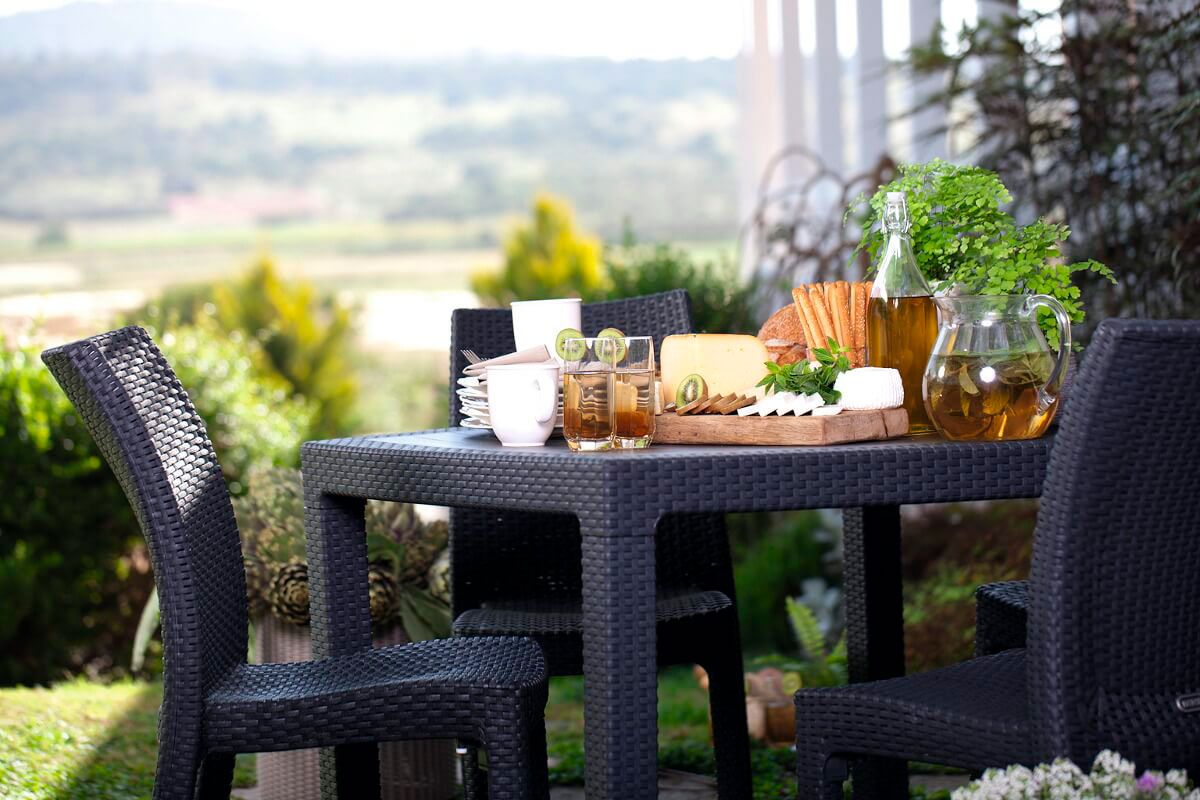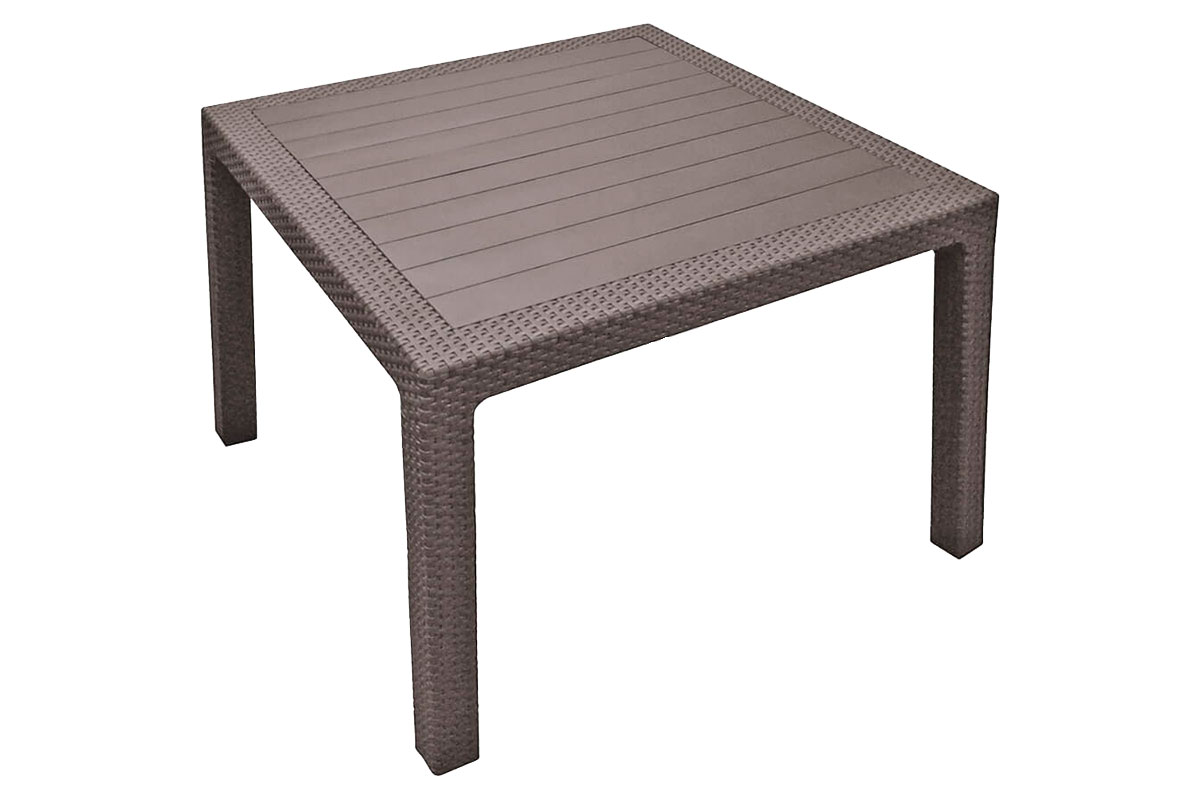 Маленький и прочный обеденный пластиковый стол на 4-х человек от компании KETER Melody Quatro порадует любителей плетеной мебели своей фактурой в стиле ротанг.