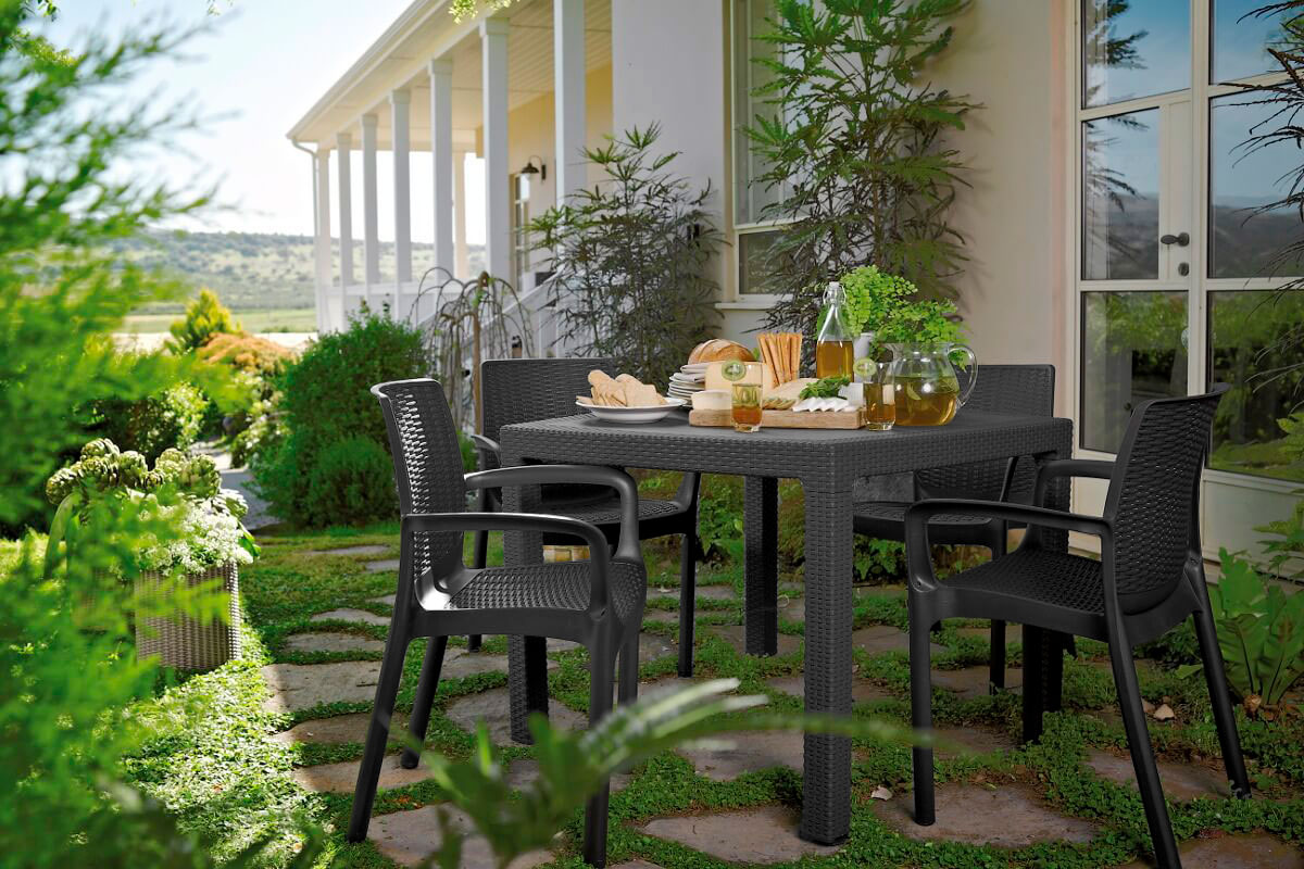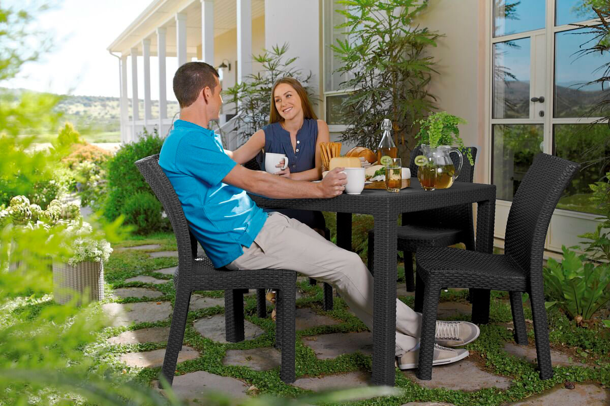 Квадратный пластиковый стол для дачи, кафе или балкона на 4-х человек от компании KETER Melody Quatro порадует любителей плетеной мебели своей фактурой в стиле ротанг.