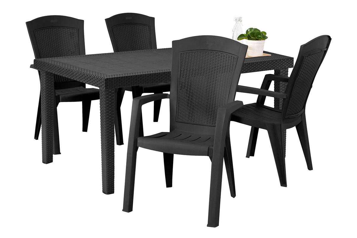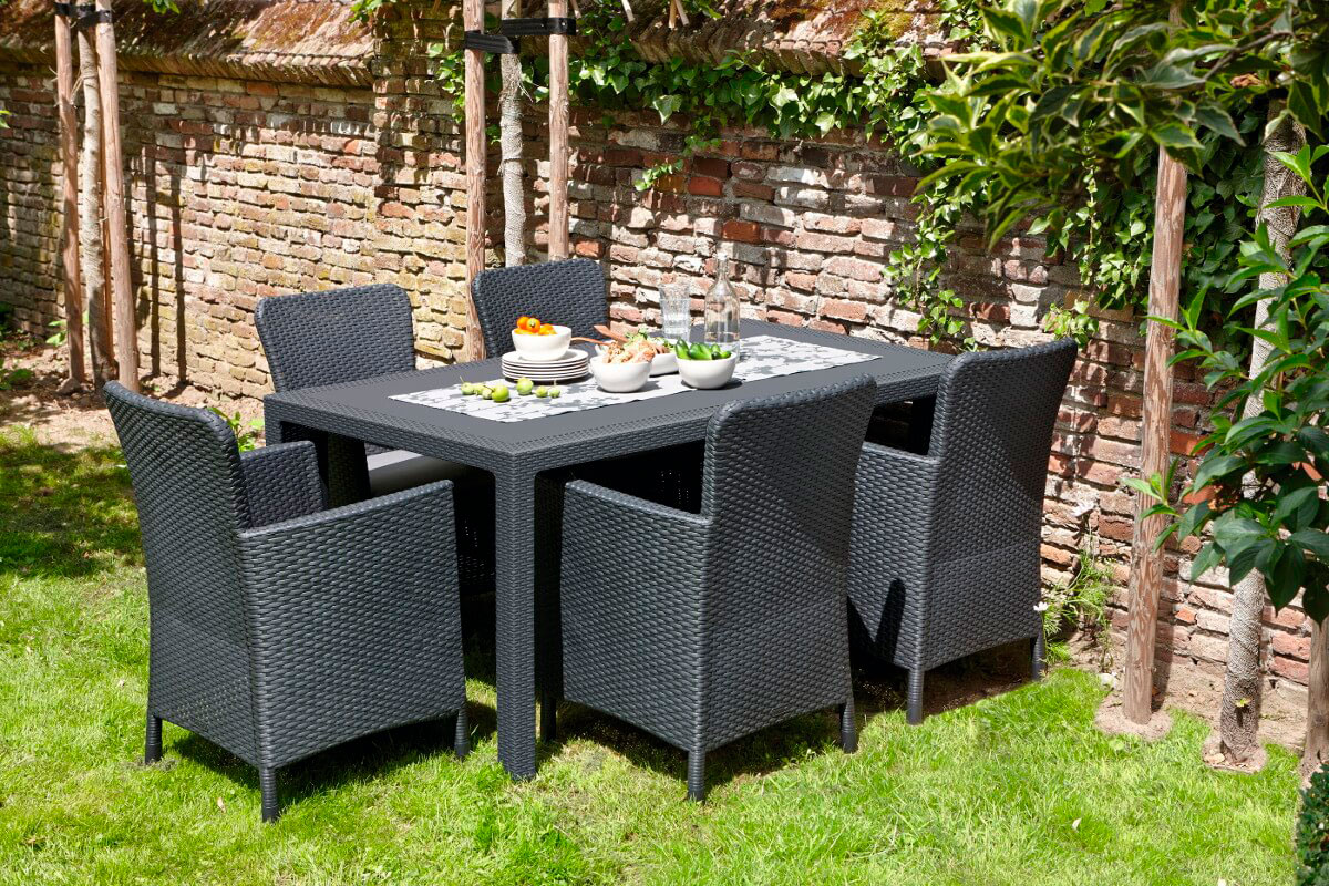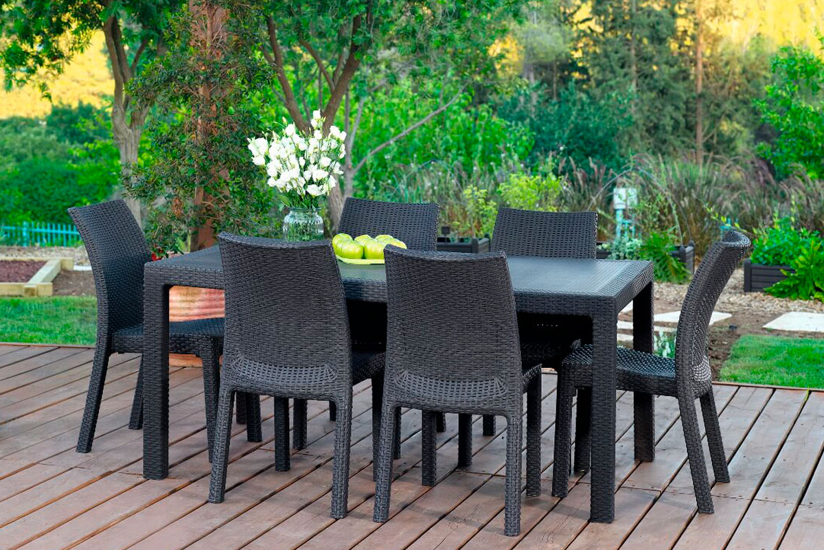 Удобный и прочный широкий пластиковый стол на 4-6 человек от компании KETER Melody порадует любителей плетеной мебели своей фактурой в стиле ротанг.