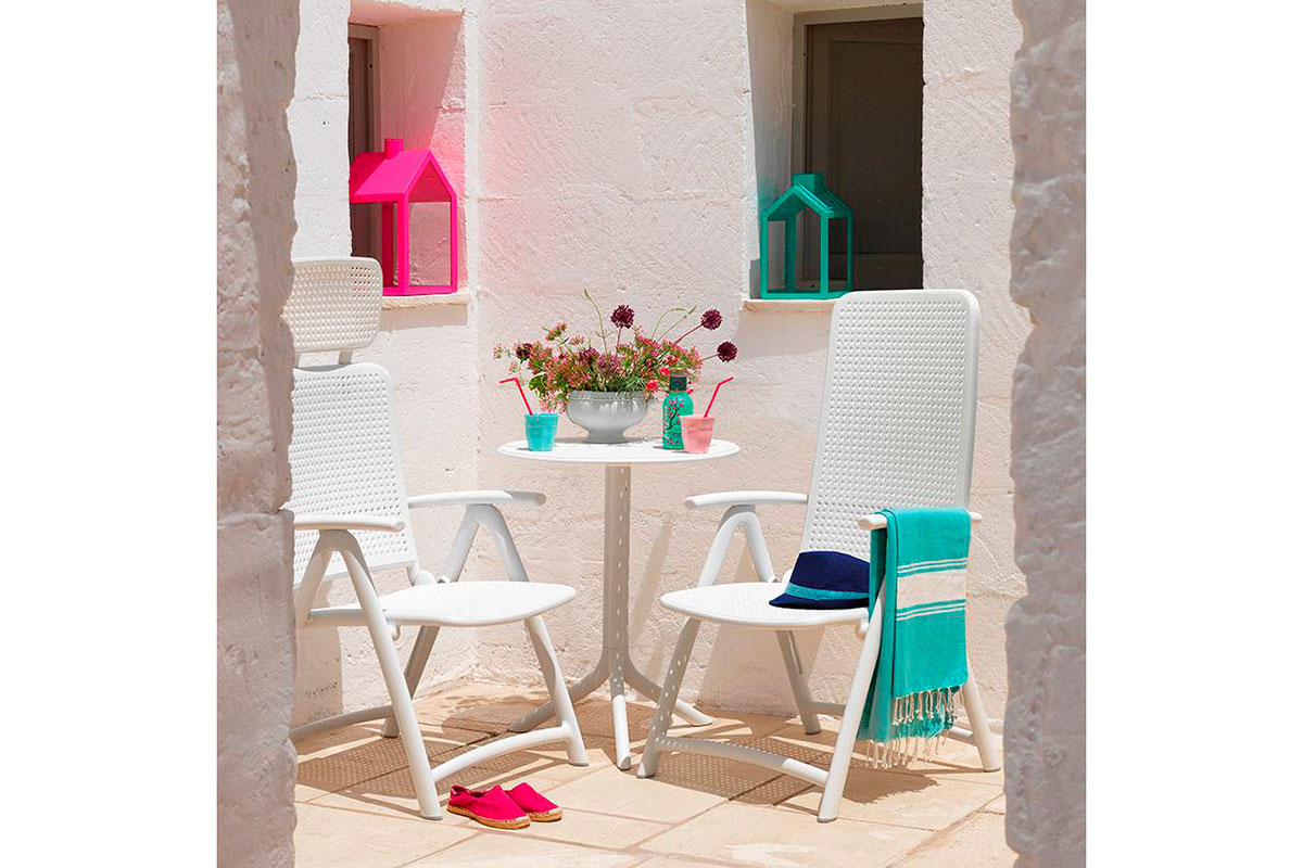 Стулья складываются и штабелируются, что удобно при сезонном хранении.